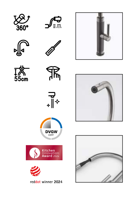- Flexible Anschlussschläuche mit 550 mm Länge und 3/8‘‘ Mutter für leichte und sichere Montage