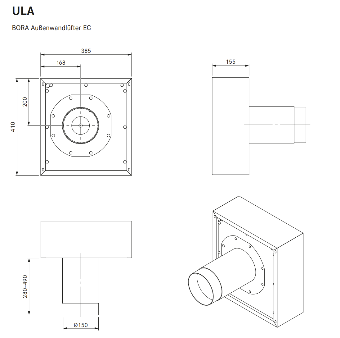 • Bei zwei Lüfterbausteinen in einem Abluftkanalsystem soll zwischen diesen beiden Lüftern ein Mindestabstand von 3 m eingehalten werden • Für die Ausströmung muss mindestens ein Abstand von 40 cm nach unten gegeben sein • Für die Montage an der Gebäudeaußenseite • Geeignet für Wandstärken von 280 mm bis 490 mm • Ein KG-Rohr Ø 200 mm sollte wenn nötig in der Außenmauer vorinstalliert werden • Luftauslass nach unten • Befestigungsmittel sind bauseits zur Verfügung zu stellen • Nicht Blower-Door-Test geeignet • Die Rückschlagklappen-Achse muss vertikal ausgerichtet werden