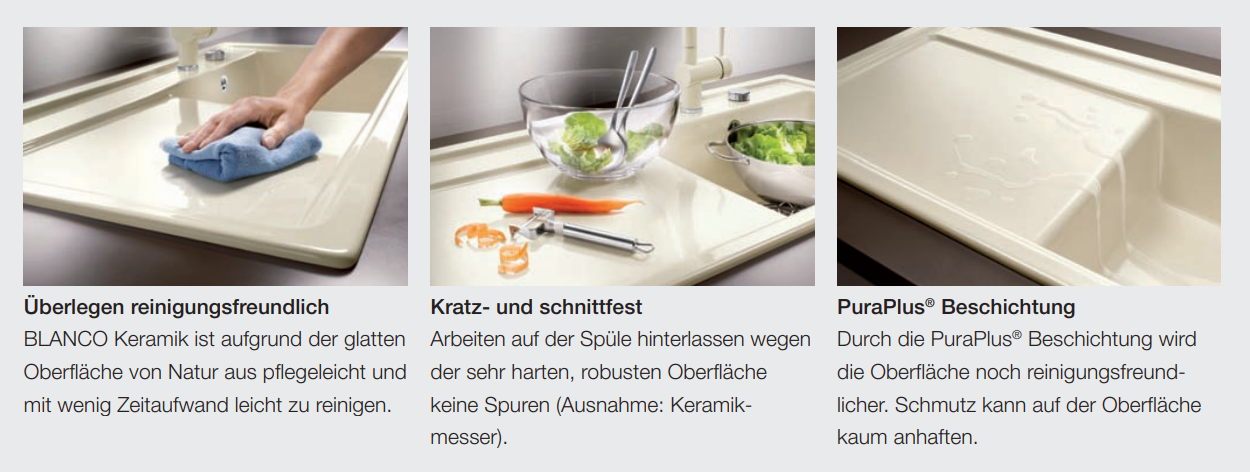Die besonderen Eigenschaften von BLANCO Keramik: Überlegen pflegeleicht Schlag- und stoßfest bei haushaltsüblichem