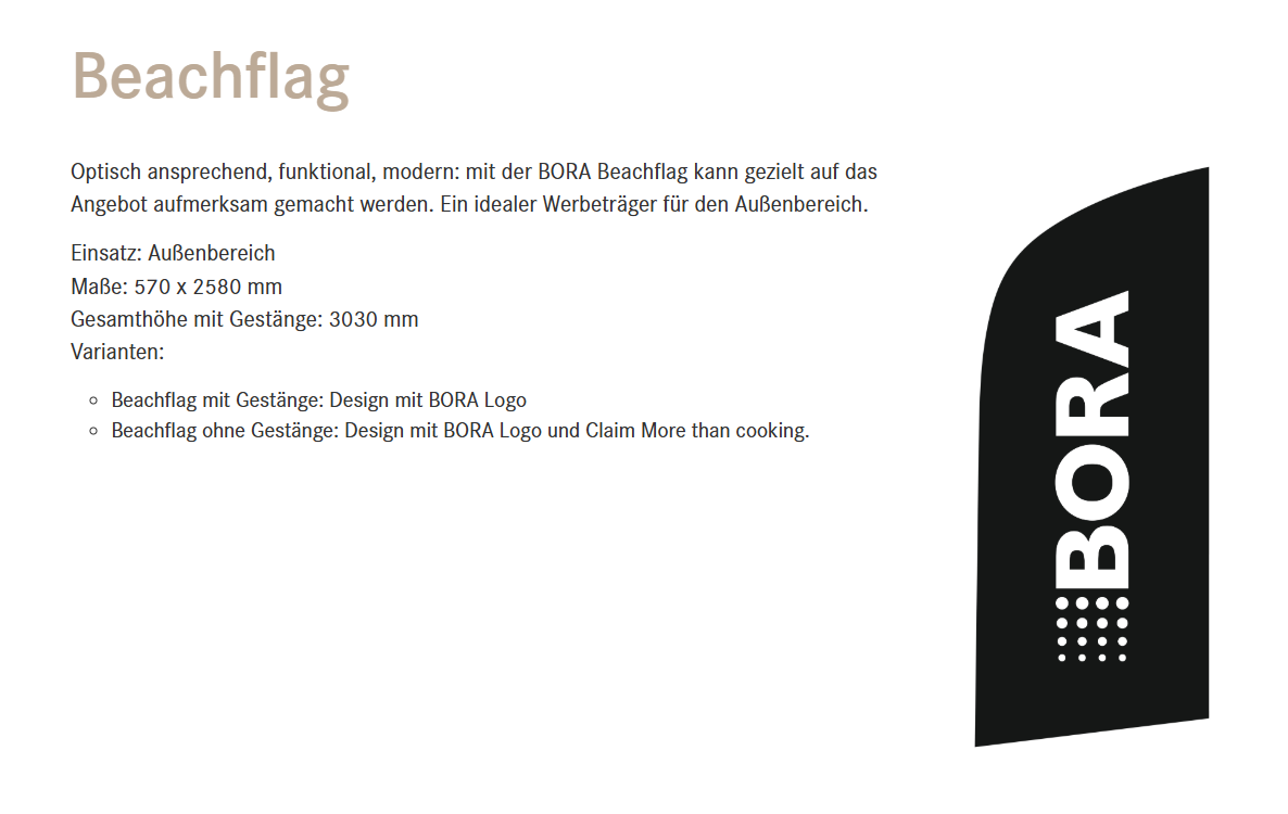 - Beachflag ohne Gestänge: Design mit BORA Logo und Claim More than cooking.