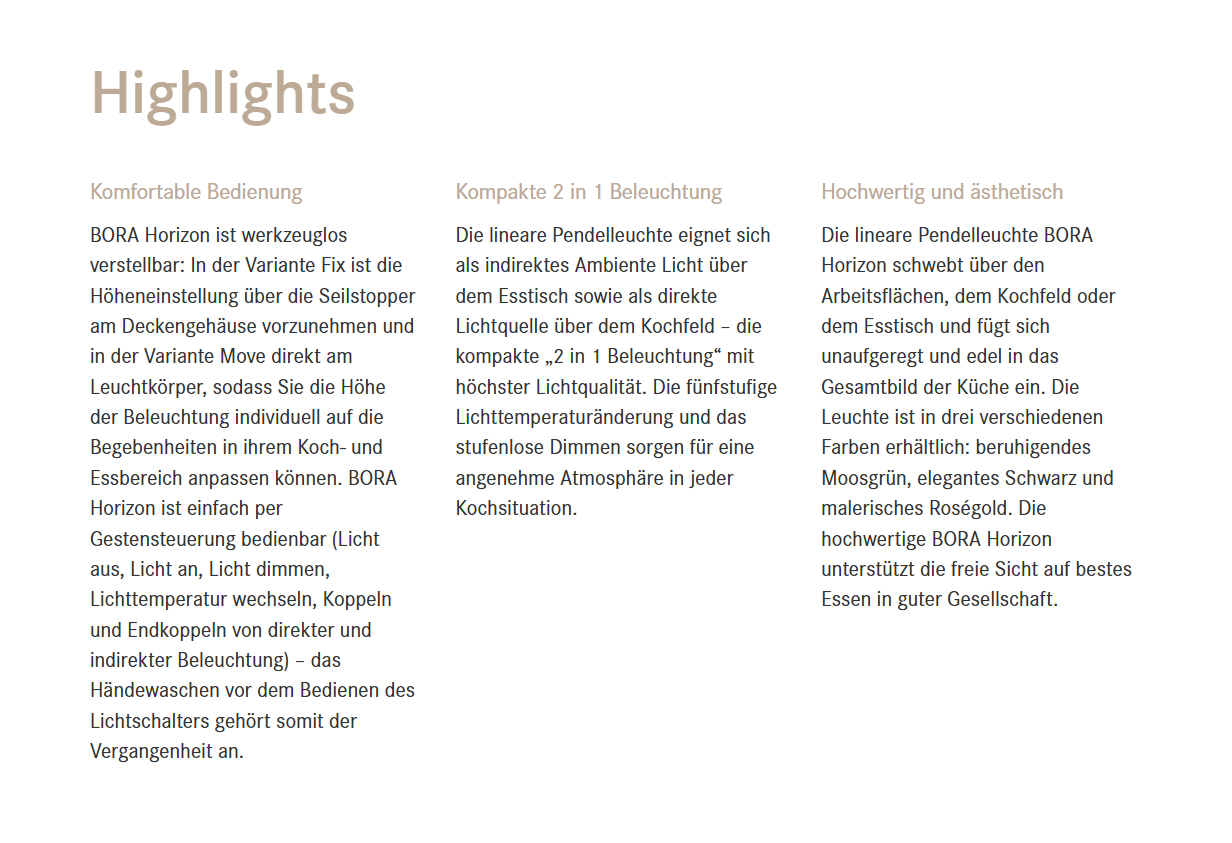 Die lineare Pendelleuchte BORA Horizon eignet sich als indirektes Ambiente Licht über dem Esstisch genauso wie als direkte Lichtquelle über dem Kochfeld - die kompakte "2 in 1 Beleuchtung" mit höchster Lichtqualität. Die fünfstufige Farbtemperaturänderung sowie das stufenlose Dimmen sorgen für eine angenehme Atmosphäre in jeder Kochsituation. BORA Horizon ist einfach per Gestensteuerung bedienbar (Licht aus, Licht an, Licht dimmen, Farbtemperatur wechseln) - das Händewaschen vor dem Bedienen des Lichtschalters gehört somit der Vergangenheit an.
