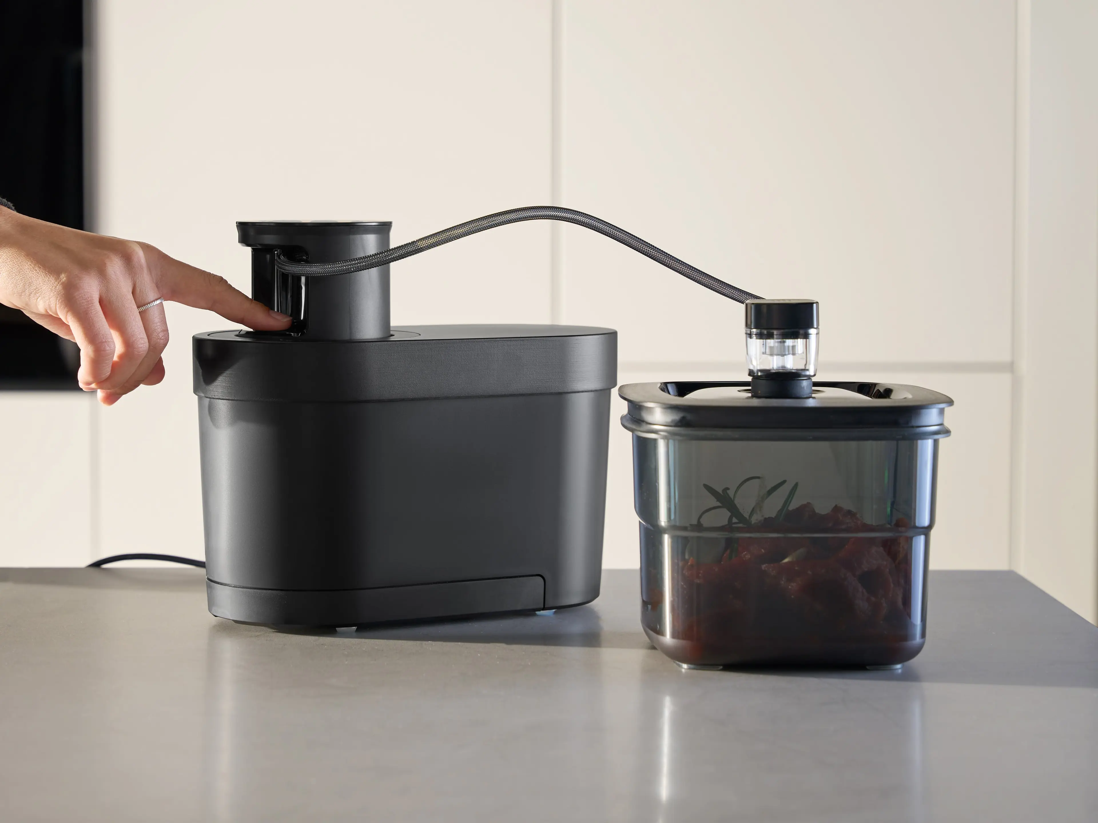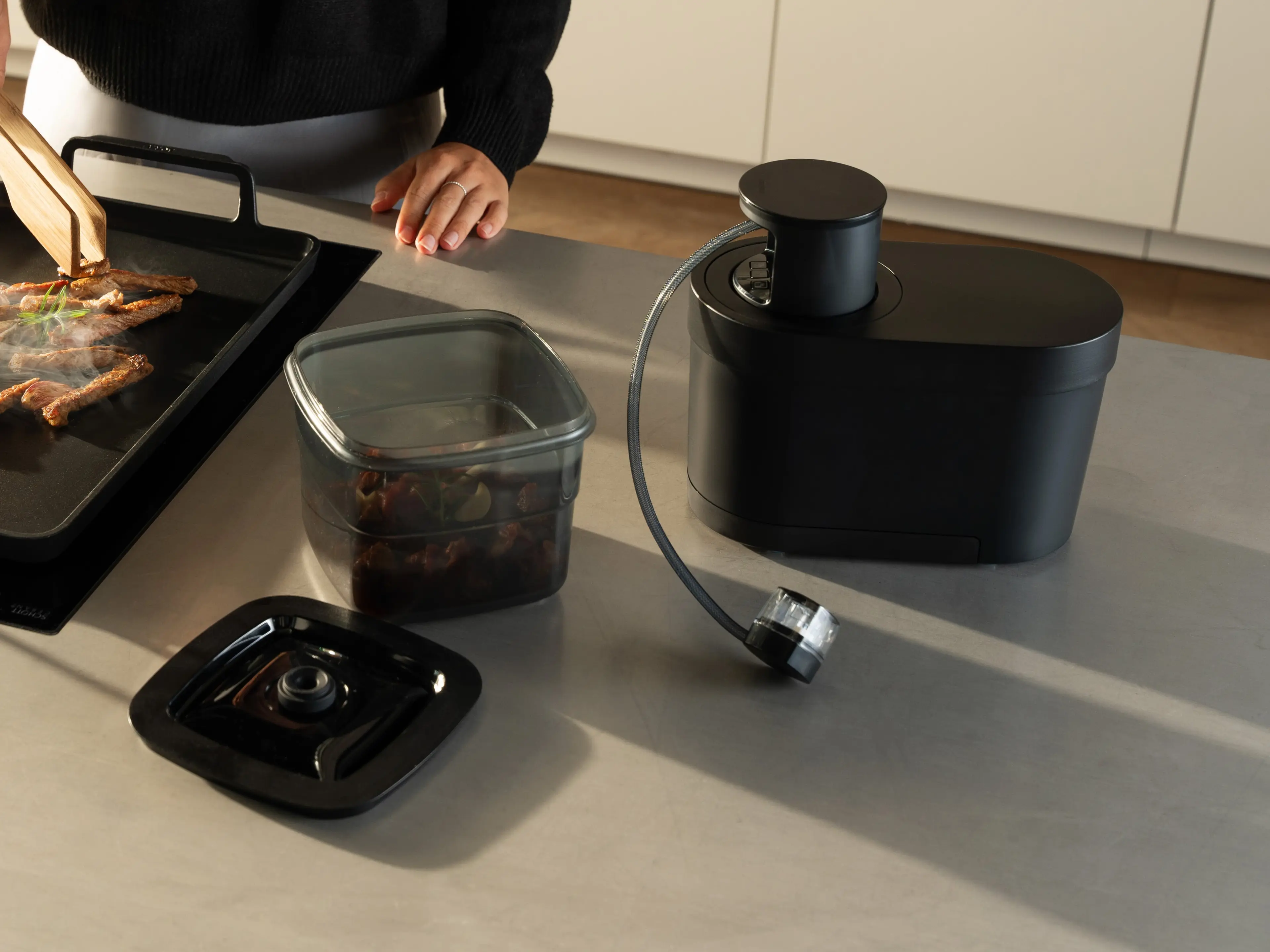QVac Marinier-Ring Extra schnelles MarinierenDurch den Marinier-Ring, der auf eine der zugehörigen Vakuumierboxen gesetzt wird, entsteht ein Unterdruck.Die zugehörige Funktion sorgt dafür, dass der Vakuumprozess in maximal zehn Minuten, statt mehrerer Stunden oder Tage, durchlaufen wird. So dringt die Marinade besonders tief in die Lebensmittel ein.
