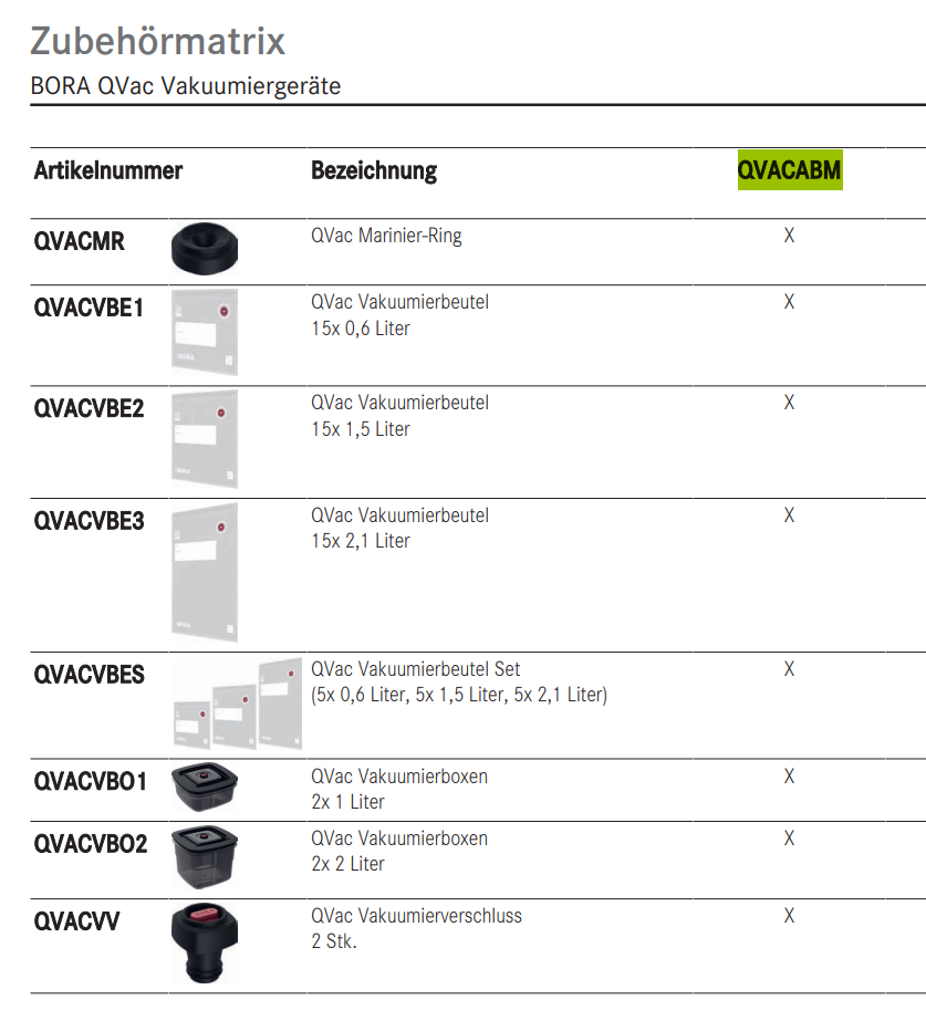 QVac Vakuumierbeutel BORA QVacDer Einbauvakuumierer für länger haltbare Lebensmittel und außergewöhnlich frischen Geschmack.Mit dem QVac Einbauvakuumierer Lebensmittel bis zu dreimal länger haltbar machen und Lebensmittelabfälle reduzieren. Durch das Vakuumieren verlieren die Nahrungsmittel weder an ihrem natürlichen Geschmack noch an ihrem appetitlichen Aussehen. Der BORA QVac verfügt über drei verschiedene Funktionen: das Vakuumieren in Vakuumierboxen und Vakuumierbeuteln, das Wiederverschließen von Flasche sowie die Marinierfunktionen.