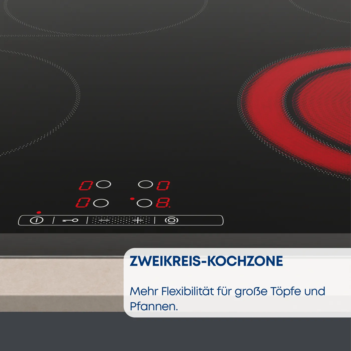 - 2-stufige Restwärmeanzeige je Kochzone: Zeigt an, welche Kochzonen noch heiß oder warm sind.