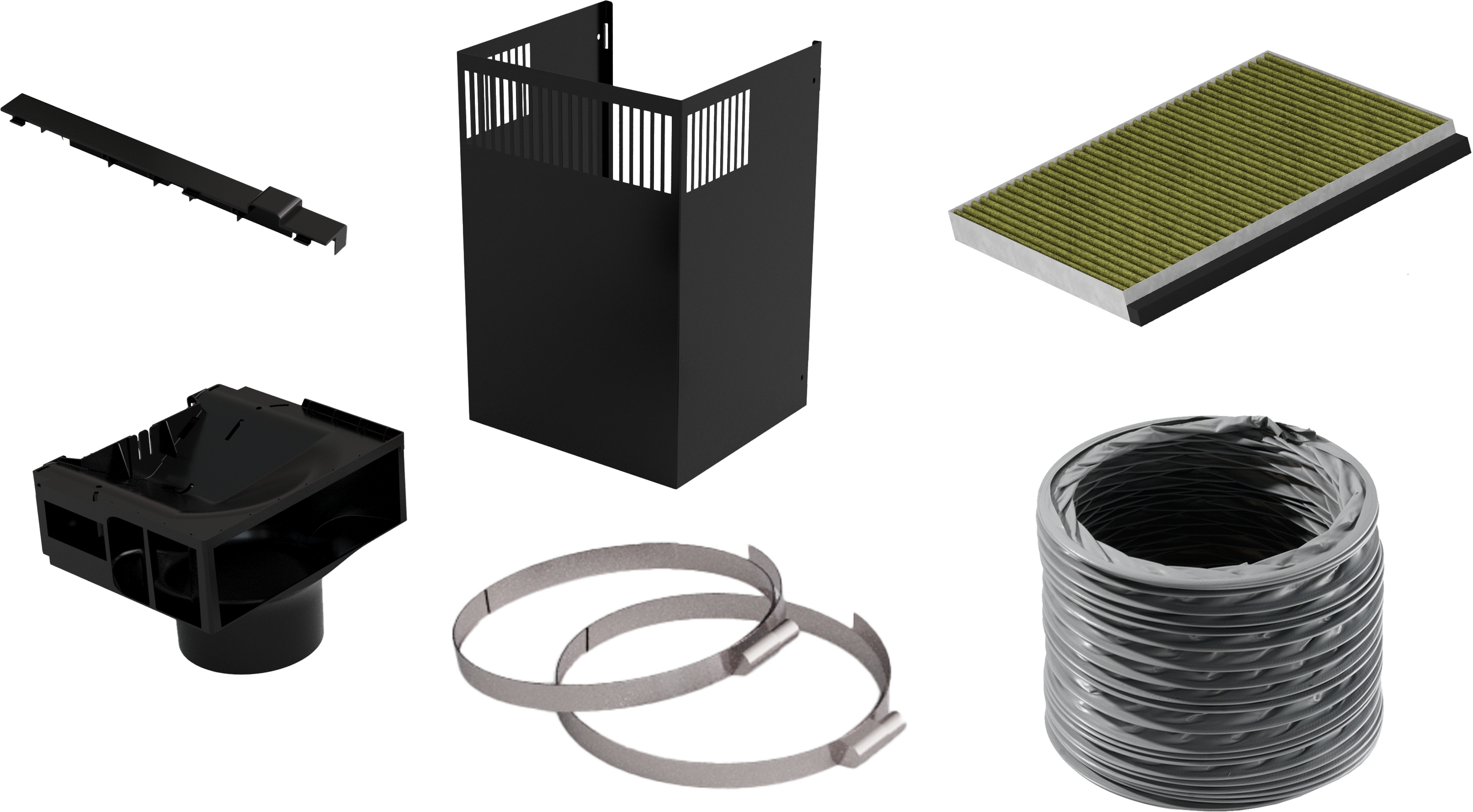 - Bestehend aus einem Long-Life Clean Air Aktivkohlefilter, Deflektor, flexiblem Schlauch, 2 Schlauchschellen und Befestigungsmaterial.