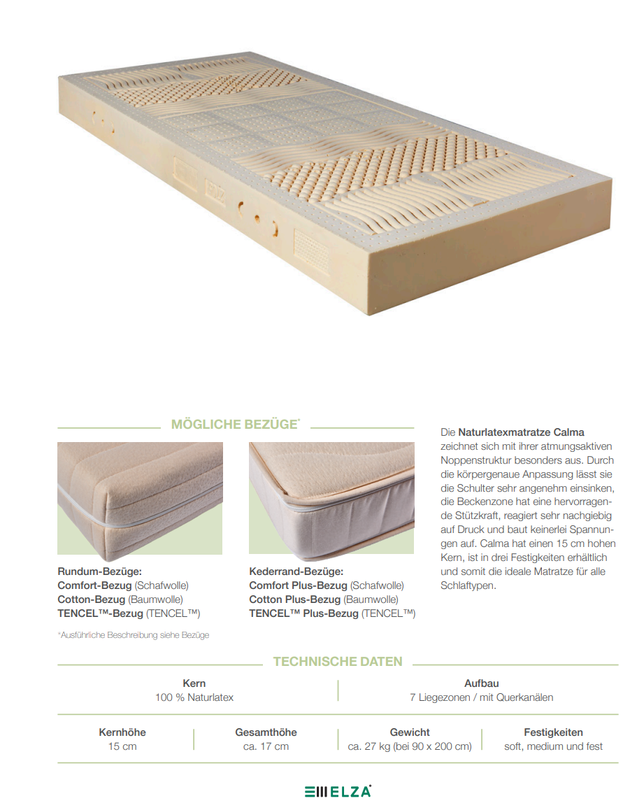Die Naturlatex-Matratze Calma zeichnet sich mit ihrer atmungsaktiven Noppenstruktur besonders aus. Durch die körpergenaue Anpassung lässt sie die Schulter sehr angenehm einsinken, die Beckenzone hat eine hervorragende Stützkraft, reagiert sehr nachgiebig auf Druck und baut keinerlei Spannungen auf.