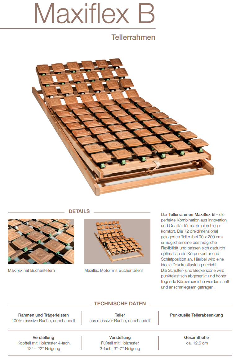 Der Tellerrahmen Maxiflex B – die perfekte Kombination aus Innovation und Qualität für maximalen Liegekomfort. Die 72 dreidimensional gelagerten Teller (bei 90 x 200 cm) ermöglichen eine bestmögliche Flexibilität und passen sich dadurch optimal an die Körperkontur und Schlafposition an. Hierbei wird eine ideale Druckentlastung erreicht. Die Schulter- und Beckenzone wird punktelastisch abgesenkt und höher liegende Körperbereiche werden sanft und anschmiegsam getragen.