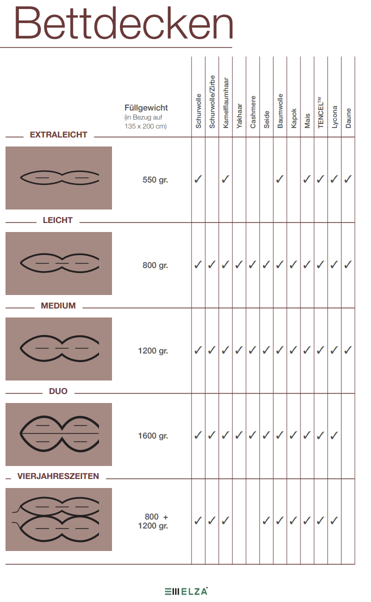 Füllung: 100 % Kamelflaumhaar, entgrannt Bezug: Feinbatist, 100% Baumwolle aus kontrolliert biologischem Anbau Pflegehinweis: Füllung aus Naturhaar, leicht aufschütteln, regelmäßig lüften Füllgewicht:Bei 135x200 cm - 550 gBei 155x200 cm - 650 gBei 155x220 cm - 700 gBei 200x200 cm - 800 gBei 200x220 cm - 900 gBei 240x220 cm - 1100 g Eigenschaften: sehr gute Feuchtigkeitsaufnahme und Temperaturausgleich. Wirkt im Sommer kühlend, im Winter wärmend. Sehr leicht, weich und anschmiegsam. Strapazierbar und sehr langlebig. Die Klimaeigenschaften und die Feuchtigkeitsregulierung sind hervorragend. Kamelflaumhaar:Hellgelbe oder hellbraune Wolle, die das zweihöckrige Kamel sowohl gegen Kälte als auch gegen Hitze schützt. Für hochwertige Kamelflaumhaar-Decken wird nur das abgeworfene, besonders weiche Flaumhaar eingesammelt, gesäubert und zu einem weichen Vlies verarbeitet. Auf rein natürlicher Basis, also mit Seife und frischem Wasser, wird das Kamelflaumhaar gewaschen und anschließend getrocknet. Unser verarbeitetes Kamelflaumhaar stammt von den Jungtieren des Trampeltiers, die in den Hochebenen Asiens beheimatet sind. Sie verfügen über ein luftiges und vielschichtiges Haarkleid, das sie vor den großen Temperaturschwankungen schützt.