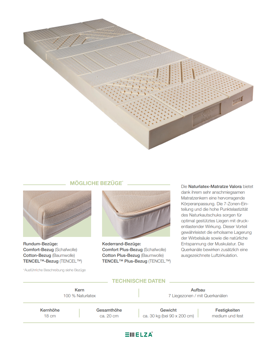 Die Naturlatex-Matratze Valora bietet dank ihrem sehr anschmiegsamen Matratzenkern eine hervorragende Körperanpassung. Die 7-Zonen-Einteilung und die hohe Punktelastizität des Naturkautschuks sorgen für optimal gestütztes Liegen mit druckentlastender Wirkung. Dieser Vorteil gewährleistet die erholsame Lagerung der Wirbelsäule sowie die natürliche Entspannung der Muskulatur. Die Querkanäle bewirken zusätzlich eine ausgezeichnete Luftzirkulation.
