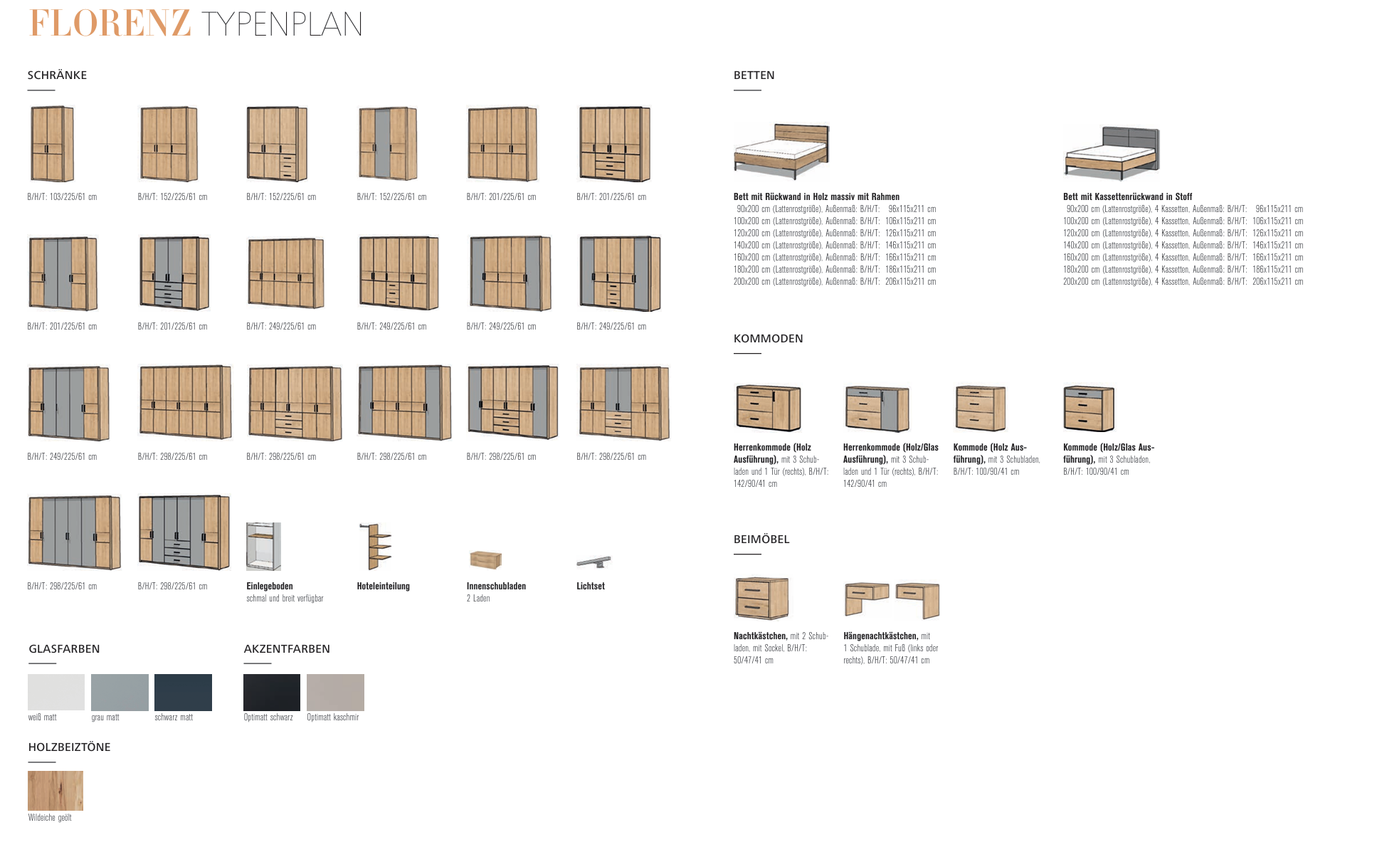 Beschreibung:3x Glas-/Akzenttüren (grau, anthrazit, weiß) 2x Holztüren 4 Einlegenböden breit 2 Kleiderstangen breit2 Einlegeböden schmal1 Kleiderstange schmalAkzentfronten wahlweise: Optimatt schwarz oder Optimatt kaschmirGlasfronten wahlweise: weiß matt, grau matt oder schwarz mattAbmessungen:Breite:249 cmHöhe:225 cmTiefe:61 cm