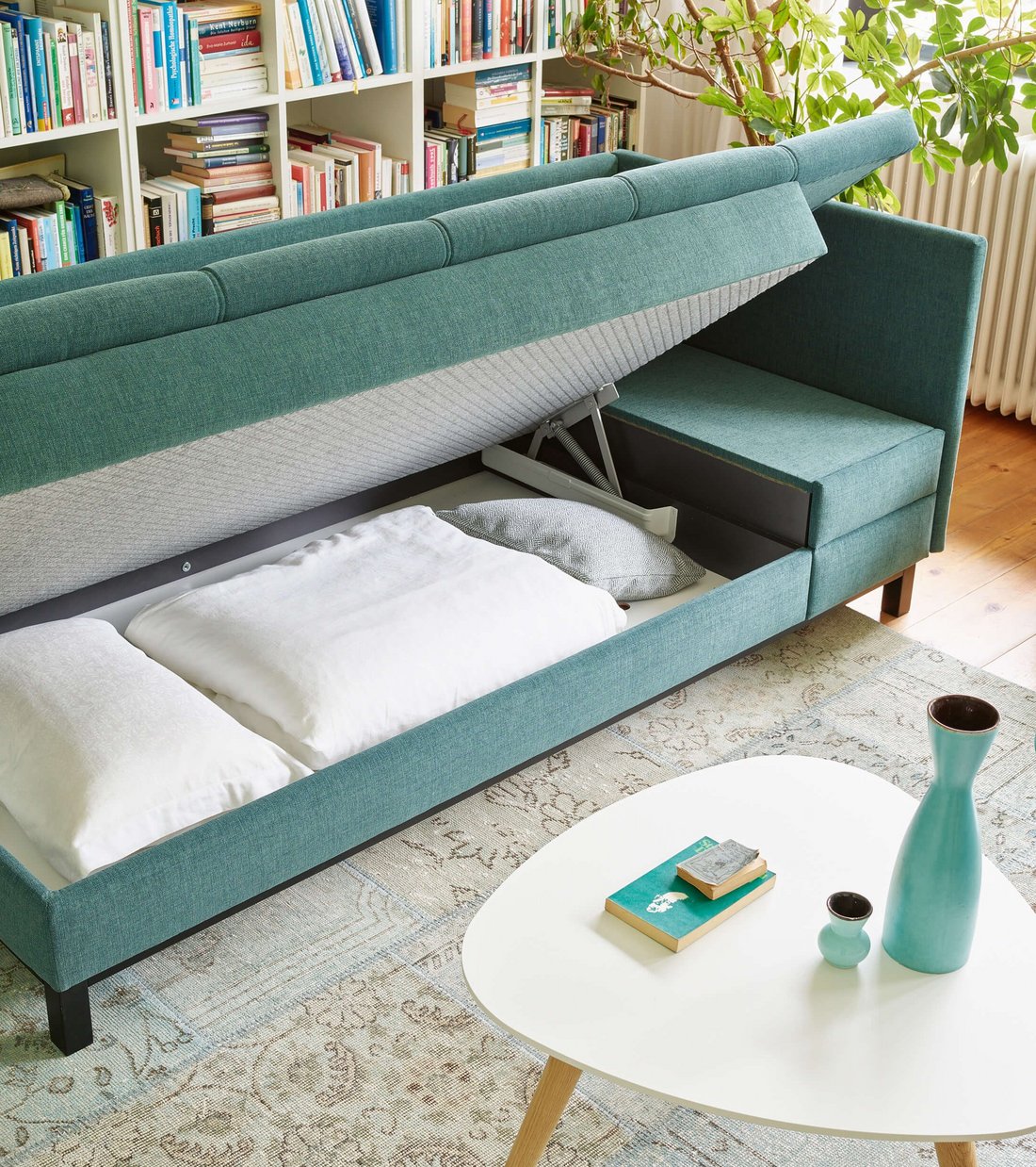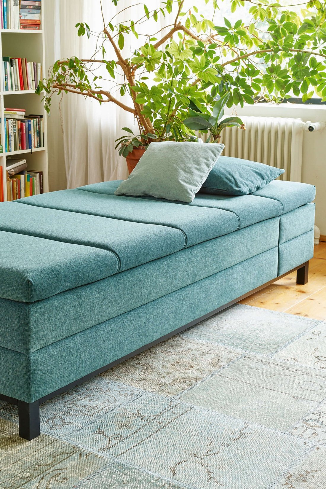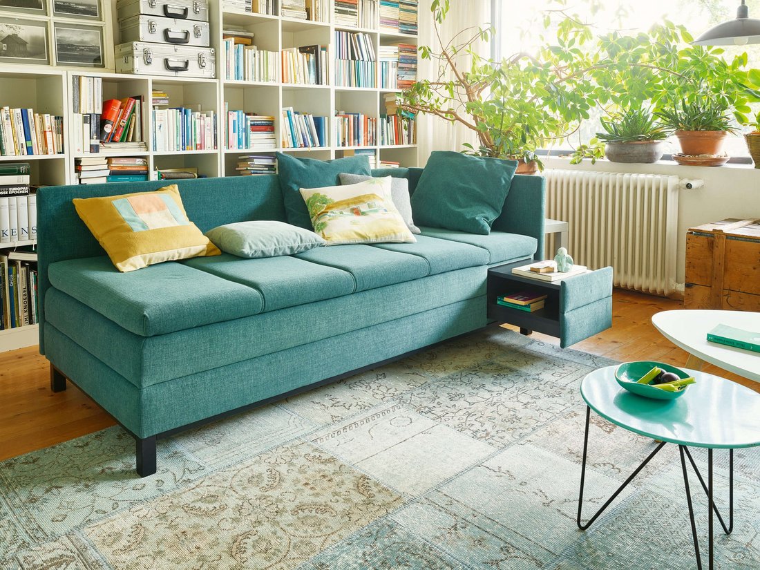 Aufgrund des integrierten Kopfhochstellers und des ausziehbaren Nachtkästchens gehört die Wohnliege »Max« zu den Allraumbetten der Extraklasse.