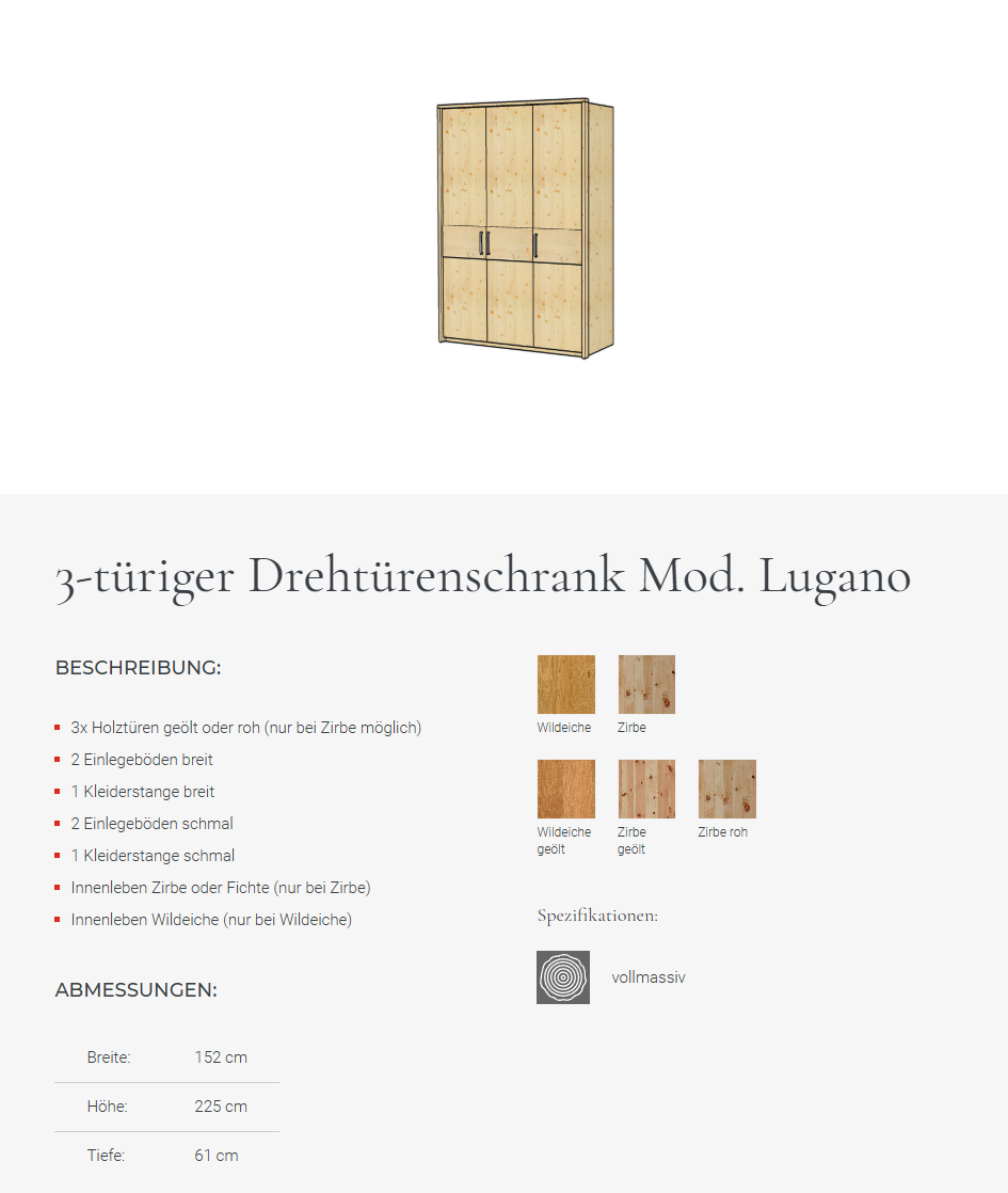Hoteleinteilung für Drehtürenschrank Lugano wahlweise in Zirbe, Fichte oder Wildeiche wird zerlegt geliefert