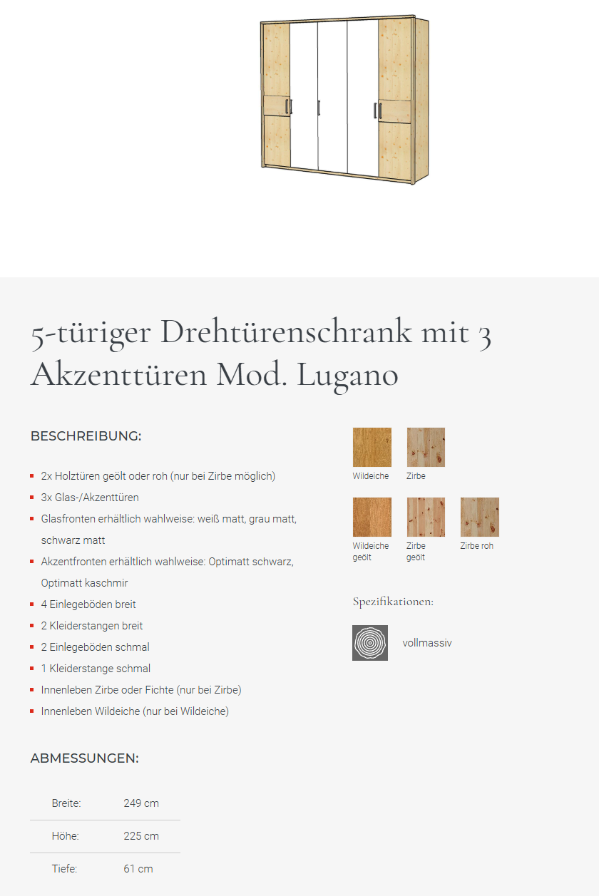 Hoteleinteilung für Drehtürenschrank Lugano wahlweise in Zirbe, Fichte oder Wildeiche wird zerlegt geliefert