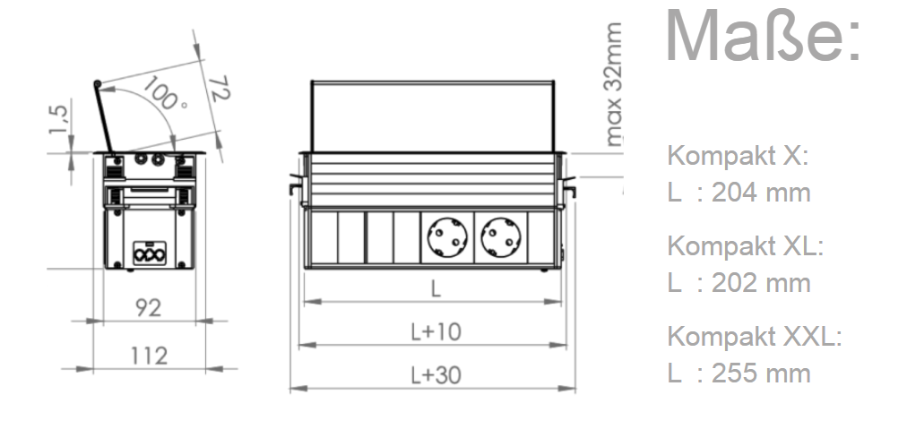 Kompakt XL 3 Schuko für mobile Geräte auf der Tischoberfläche und 6 Steckdosen für stationäre Geräte unter dem Tisch. Stromanschschluß über GST18 Anschluß. Außenmaß 201 mm in den Farben schwarz oder weiß erhältlich