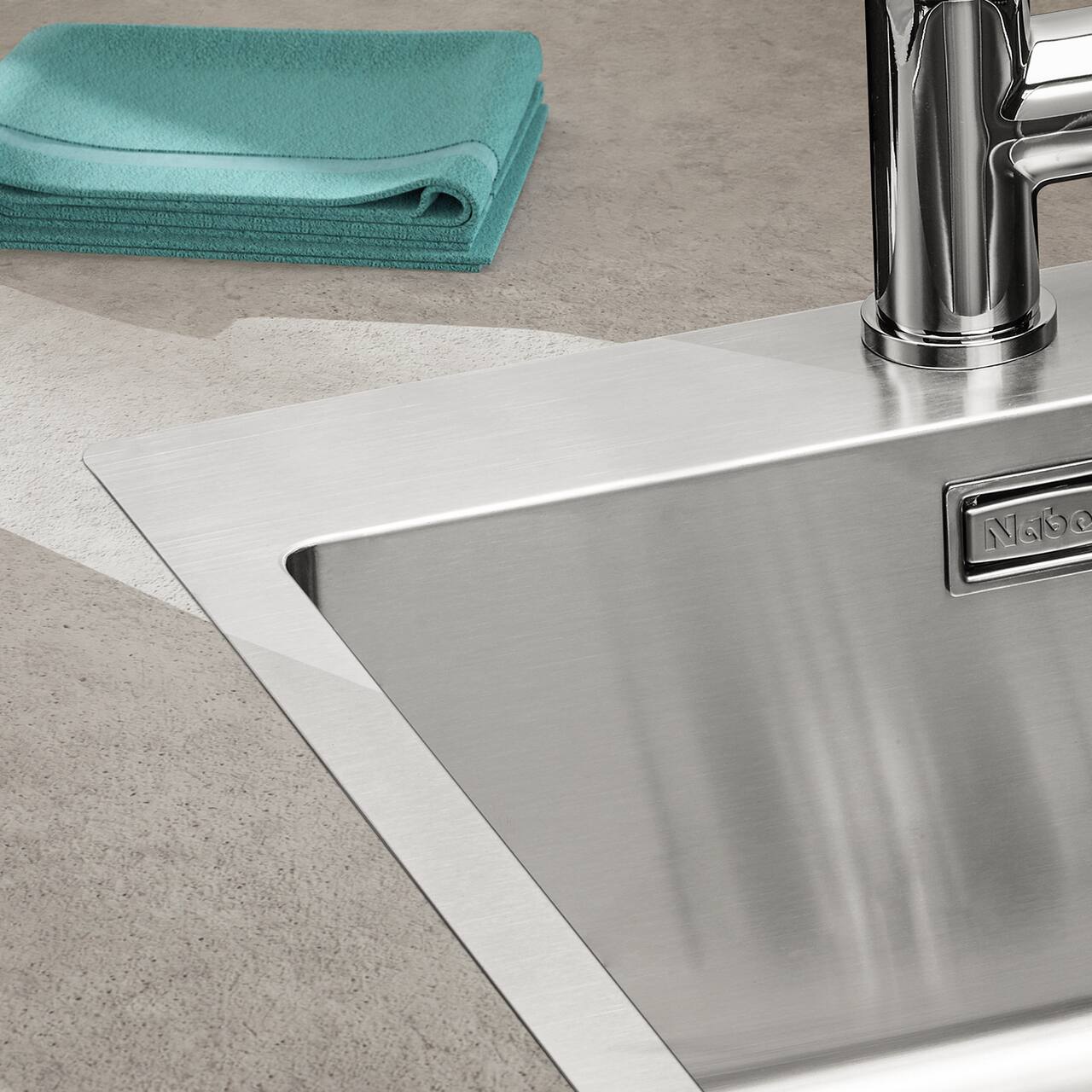 Einbau-/Unterbauspüle. Einzelbecken. 3½" Ab- und Überlaufgarnitur. Bei Verwendung der mitgelieferten Befestigungsklammern vergrößert sich die benötigte Einbaubreite je Seite um ca. 30 mm bei der Unterbauspüle.Flacher Rand: auch geeignet für den flächenbündigen Einbau Ausschnittmaß ca. 530 x 430 mm (Einbauspüle) Ausschnittmaß ca. 500 x 400 mm (Unterbauspüle) auch im Set mit Armatur Arco 1 erhältlich