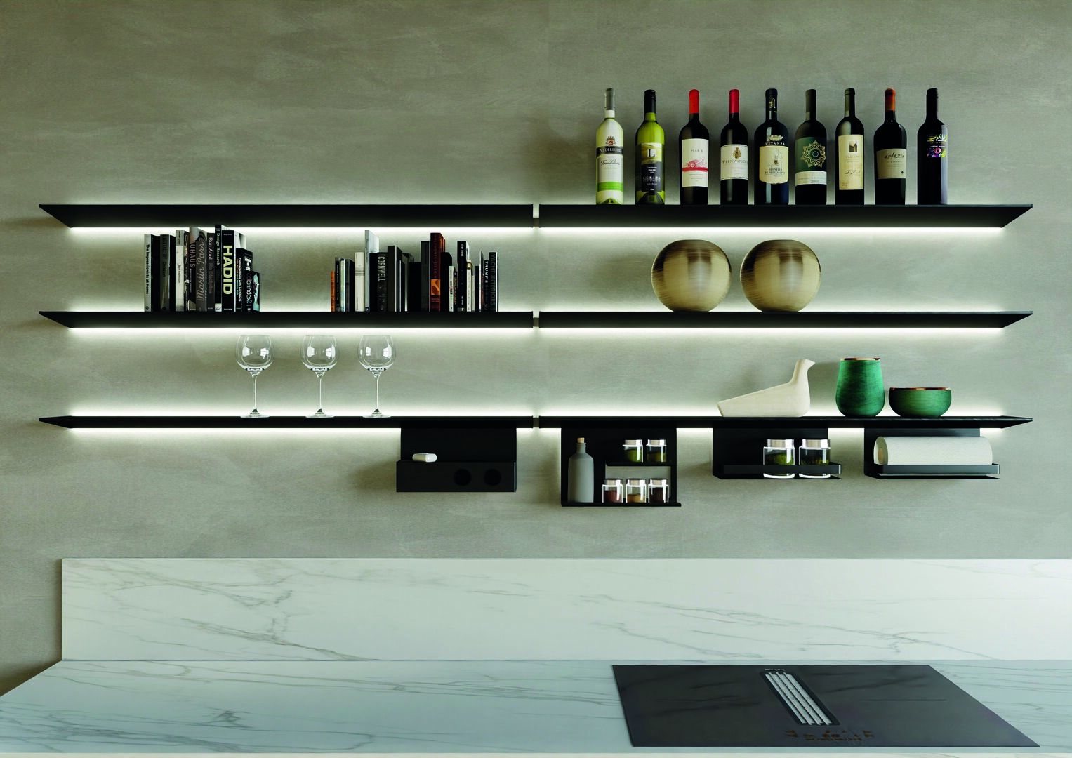 Eine clevere und platzsparende Aufbewahrungslösung für Küchenutensilien bietet das ACCOMODA® transFORM Solitärregal. Da es platzsparend an der Wand befestigt wird, eignet es sich ideal auch für kleine Küchenbereiche. Mit seinem modernen und industriellen Design in einem matten Schwarz setzt das Regalsystem einen attraktiven Einrichtungsakzent im Raum. Durch die schlichte Gestaltung bietet es viele Kombinationsmöglichkeiten mit unterschiedlichen Küchenkonzepten. Zur Ausstattung gehören mehrere offene Regalböden, auf denen Kochbücher, Gläser und andere Utensilien ordentlich aufbewahrt werden können. Dank der beidseitigen Nut lassen sich bei Bedarf LED-Stripes von 8 mm aufnehmen, die die Küchenartikel noch wirkungsvoller auf den Ablagen präsentieren. Die LED-Stripes können separat bestellt werden. Für eine hohe Langlebigkeit und Widerstandsfähigkeit ist das Wandregal in stabiler und hochwertiger Qualität mit einer pulverbeschichteten Oberfläche gefertigt. Seine Montage erfolgt schnell und einfach an die Wand. Regalsystem. Schwarz matt, pulverbeschichtet.— beidseitige Nut zur Aufnahme von 8 mm LED Stripes (nicht im Lieferumfang enthalten)— einfache und schnelle Montage— Tragkraft ca. 50 kg/qm