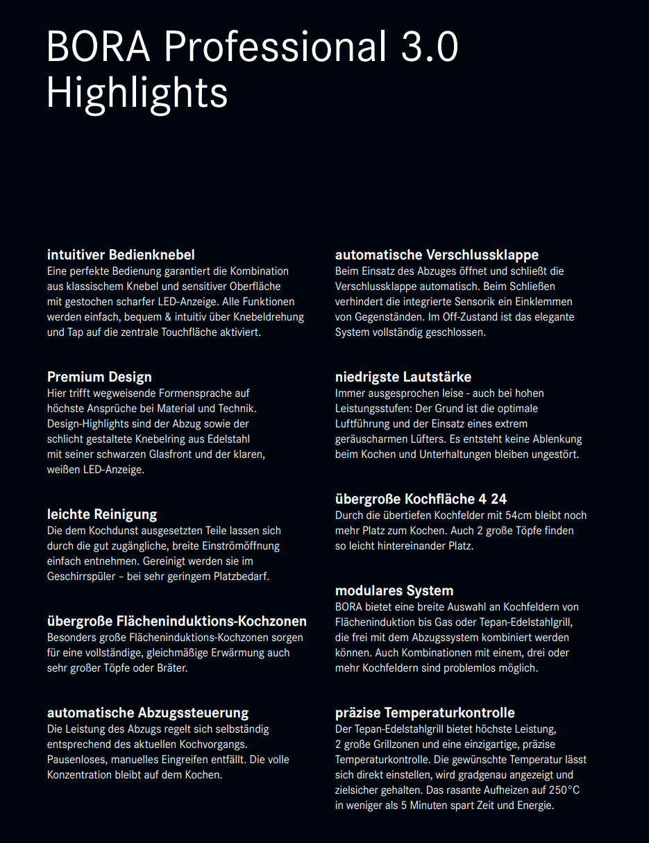 Bora Professional 3.0 Sets Produktbeschreibung • intuitiver Bedienknebel • übergroße Flächeninduktions-Kochzonen • Leistungsstufenanzeige am Kochfeld • variable Warmhaltefunktion • Brückenfunktion • Kindersicherung • Timer Kochzonen • Kurzzeitwecker • Demomodus • Pausefunktion Lieferumfang • Flächeninduktions-Kochfeld PKFI3 • 2 x Bedienknebel • 2 x Verbindungsleitung Bedienknebel • Verbindungsleitung zum Abzug • Bedienungs- und Montageanleitung • Montagelaschen • Höhenausgleichsplattenset • Netzanschlussleitung (1,5m) Zubehör • Grillpfanne für Flächeninduktion KWGPFI Produkt- und Planungshinweise • Montage um 180° gedreht möglich • Beachten Sie, dass bei Induktionskochfeldern induktionsfähiges Kochgeschirr verwendet werden muss • Sorgen Sie unterhalb des Kochfeldes für ausreichend Belüftung