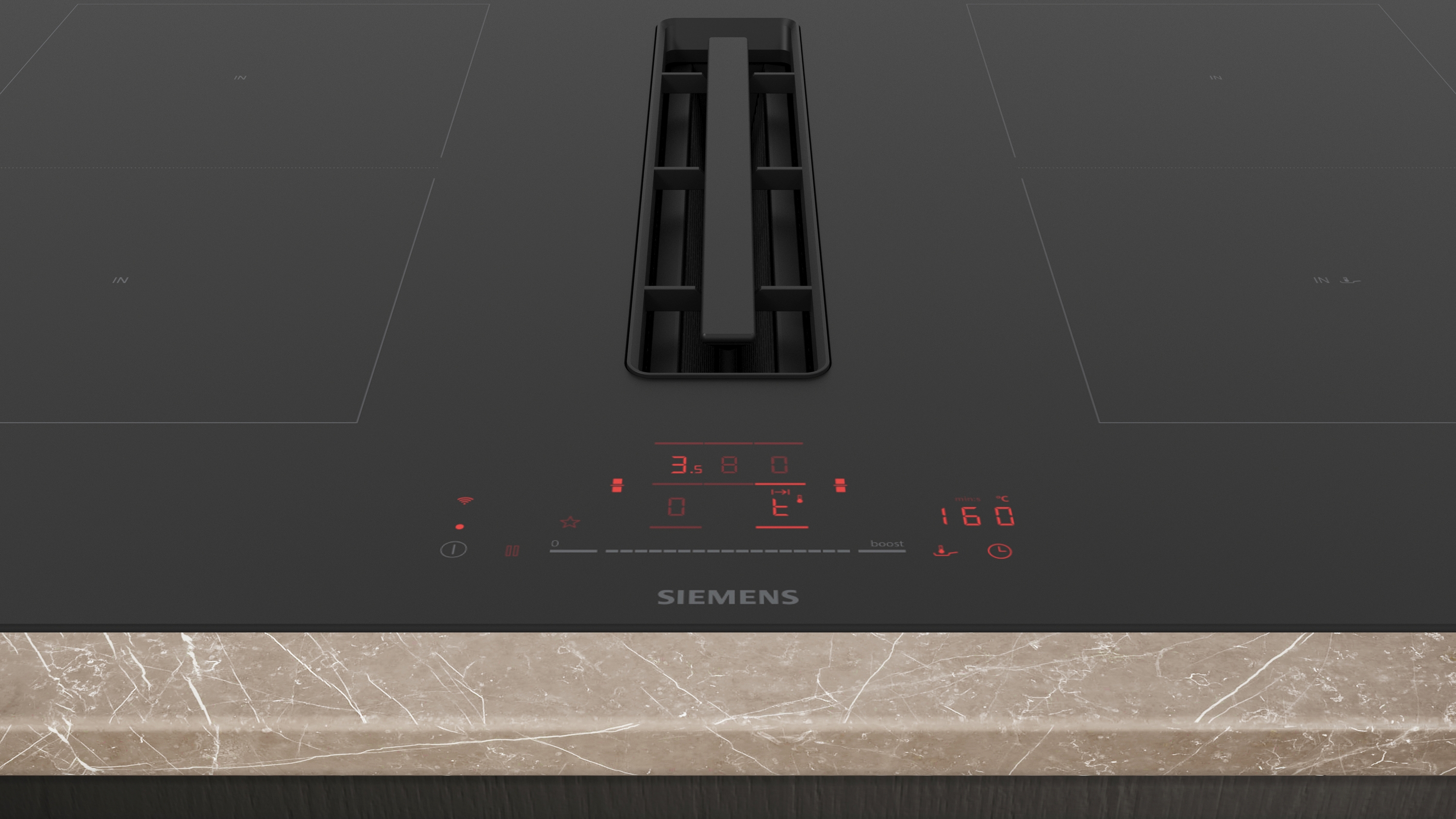 - Induktionskochfeld mit vollintegriertem, leistungsstarkem Downdraft-Abzugsmodul.