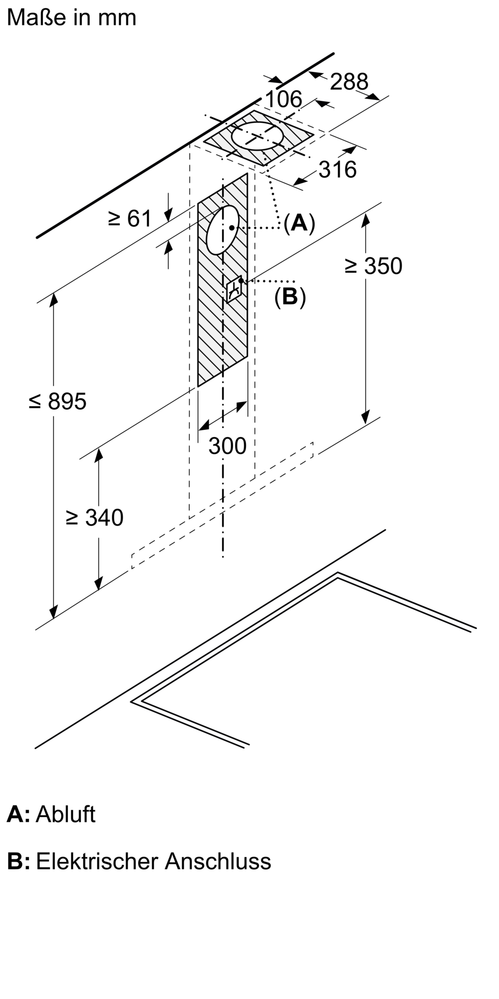 - Gerätemaße Abluft (HxBxT): 635-895 x 898 x 500 mm
