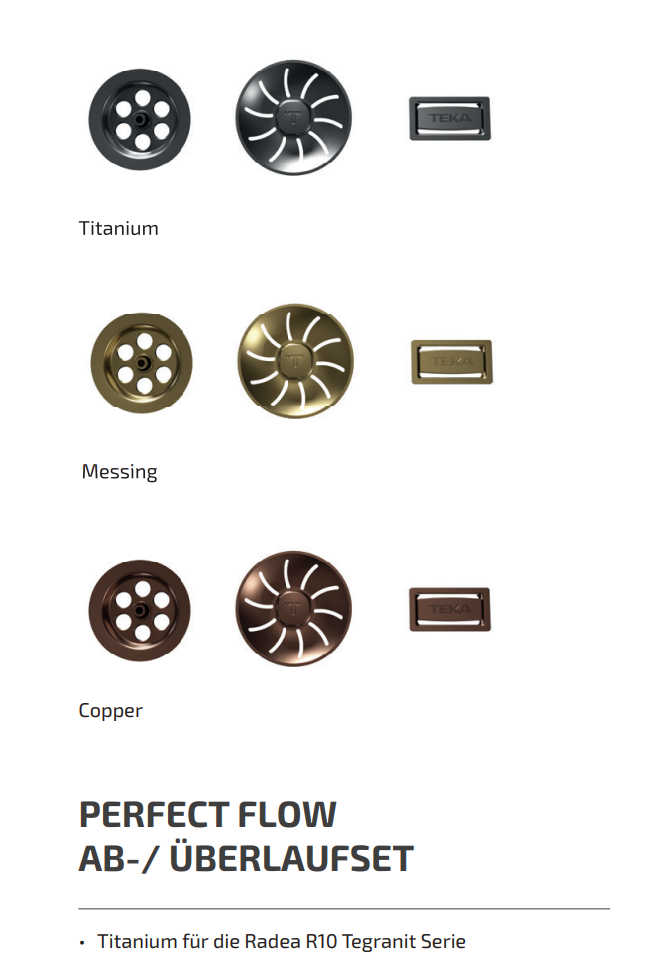 TEKA RADEA R10 40.40 M-TG Tegranite+ Spüle 2-in-1-Installationsmöglichkeiten: Auf- oder Unterbau passend für Unterschränke ab 50 cm 1 Spülbecken Hohe Widerstandsfähigkeit gegen Stöße, hohe Temperaturen und Temperaturschocks Ausgezeichnete UV-Beständigkeit gegen Verfärbung Bakterienfreie Oberfläche, sehr leicht zu reinigen 80% Quarz und Harze Manuelle 3½-Zoll-PerfectFlow-Ablaufgarnitur mit Überlauf und Siphon Teka Tegranite+ Spülen haben sich zu einem Arbeitsbereich für Küchenliebhaber entwickelt, die nach Innovation, Praktikabilität und Funktionalität in der Küche suchen. Stein, Forsquare und Square sind die neusten Sortimente für unsere neuen Tegranite + -Produkte. Sie bestehen aus hochwertigem Quarz, einem aufstrebenden Material. 80% Quarz kombiniert mit Acrylharzen, um ein festes Material zu erhalten, das gegen Wärmeschocks, Stöße und Schmutz beständig ist. Darüber hinaus ist es in einer Vielzahl von Farben erhältlich. Qualität und Farbe ... Sie können wählen!