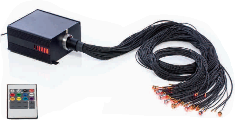 Komplett-Set mit 40 Lichtpunkten geeignet für Saunakabinen bis ca. 4 m² bestehend aus: LED-Farblichtprojektor inkl. Fernbedienung Art.-Nr. 70082 und konfektioniertem Kabelbündel (Glasfaser Ø 1,5 mm mit Außenmantel, 20 Kabel à 2,0 m Länge und 20 Kabel à 1,4 m Länge) (Gerne bieten wir Ihnen Ihr Sternenhimmelsystem nach Ihren individuellen Ausführungswünschen an)