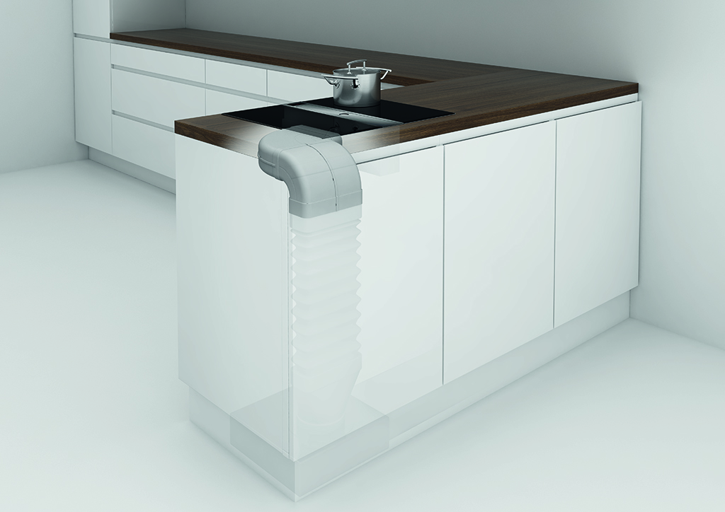 - Das Rohrset erlaubt eine platzsparende Anordnung der Abluftrohre bei Dunstabzugshauben mit Downdraft- bzw. Muldenlüftung,