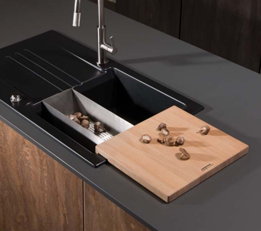 - Mit der auf Spülenrandbreite ausgefrästen Aussparung auf der Unterseite lässt sich das Buche-Schneidbrett perfekt für Arbeitsabläufe an der Spüle positionieren